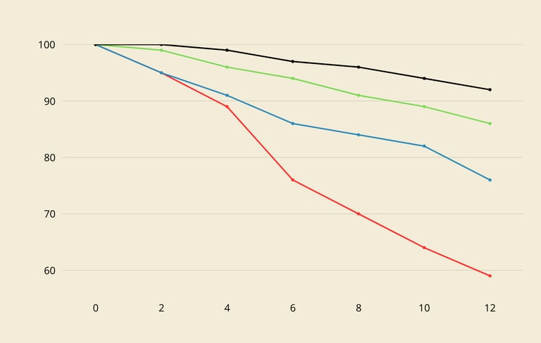 El SRT (Sitting-Rising Test) es una prueba que evalúa la flexibilidad, la fuerza muscular, el equilibrio y la coordinación de una persona midiendo la capacidad de una persona para sentarse en el suelo y levantarse sin ayuda. En esta gráfica, podemos ver el porcentaje de supervivientes a lo largo de los años según la puntuación en este test. La capacidad que evalúa el SRT no está prescrita por la persona, sino que es variable con el ejercicio.
